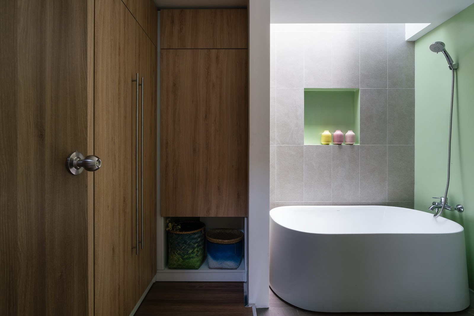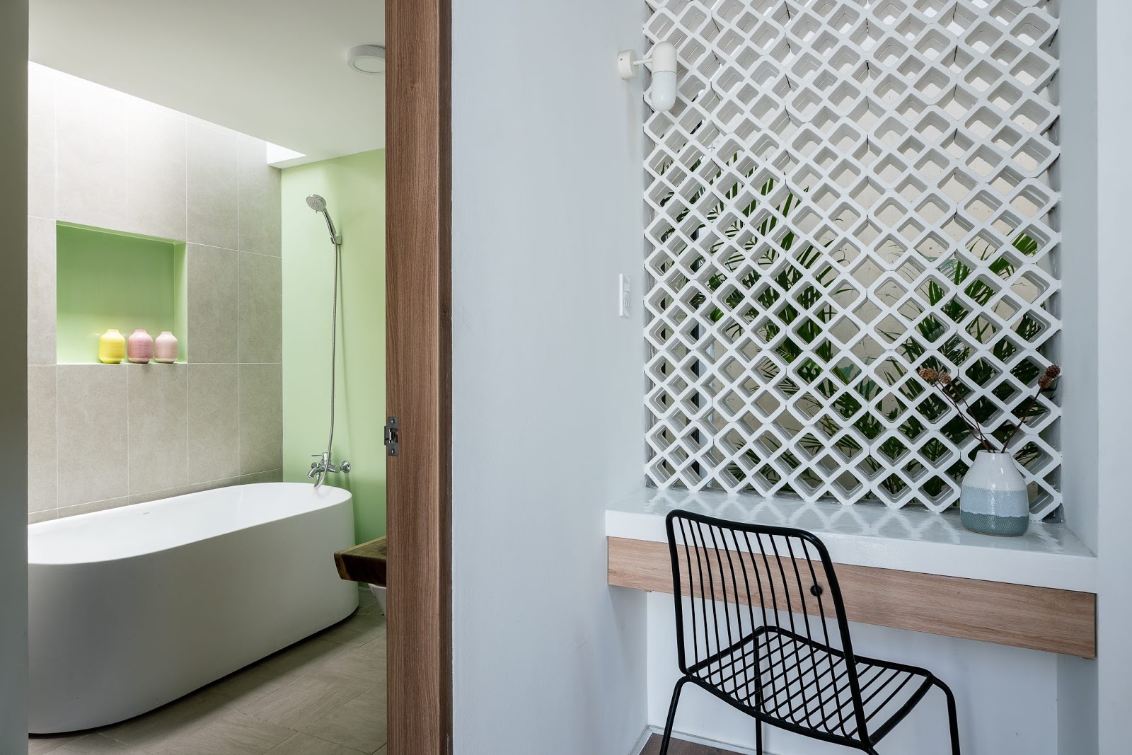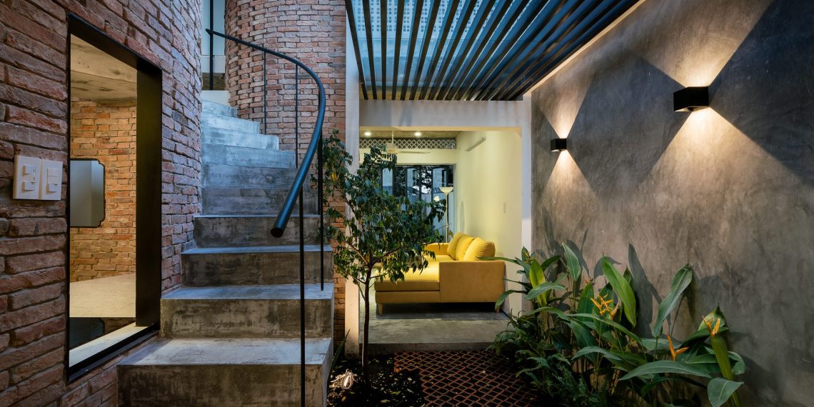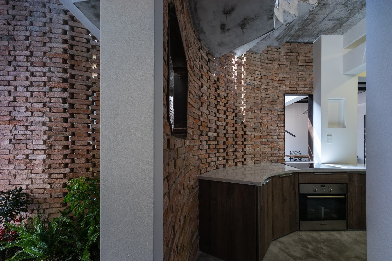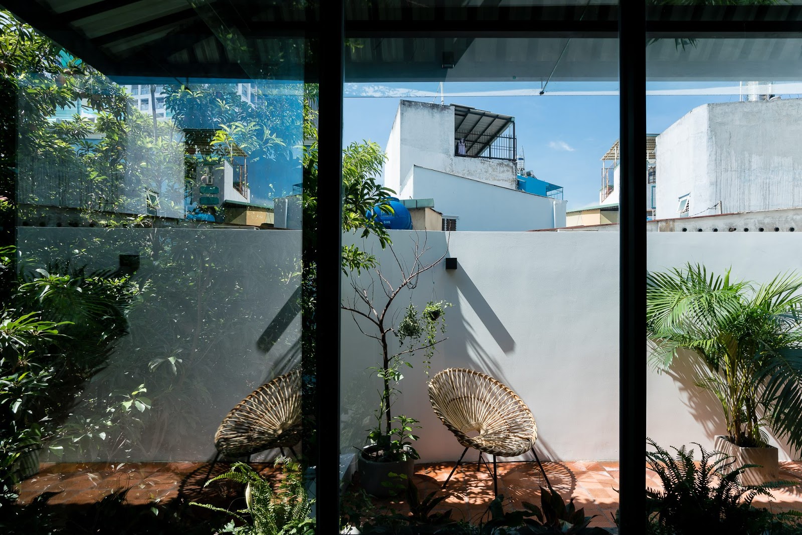 Được thiết kế cho một cặp vợ chồng trẻ có nhu cầu sinh hoạt đơn giản, khu đất bề ngang 6m là một lối thoát khỏi kích thước nhà phố điển hình Sài Gòn (4m), cho phép chia tách mặt bằng cả theo chiều dọc và chiều ngang, hình thành sự đa dạng của không gian. Tính riêng tư – yếu tố quan trọng của loại hình nhà ở – trước tiên được tổ chức theo chiều sâu và sau đó theo chiều cao của công trình. Sự tổng hợp này sẽ bố cục vị trí trước – sau – trên – dưới các thành phần chức năng. Giá trị công trình cũ được cất nhắc về tính tự thân, vậy nên nhóm kiến trúc sư đã giữ lại khung kết cấu hiện trạng, gia cố vào hệ khung mới đỡ sàn tầng lầu, nhằm tăng diện tích sử dụng.