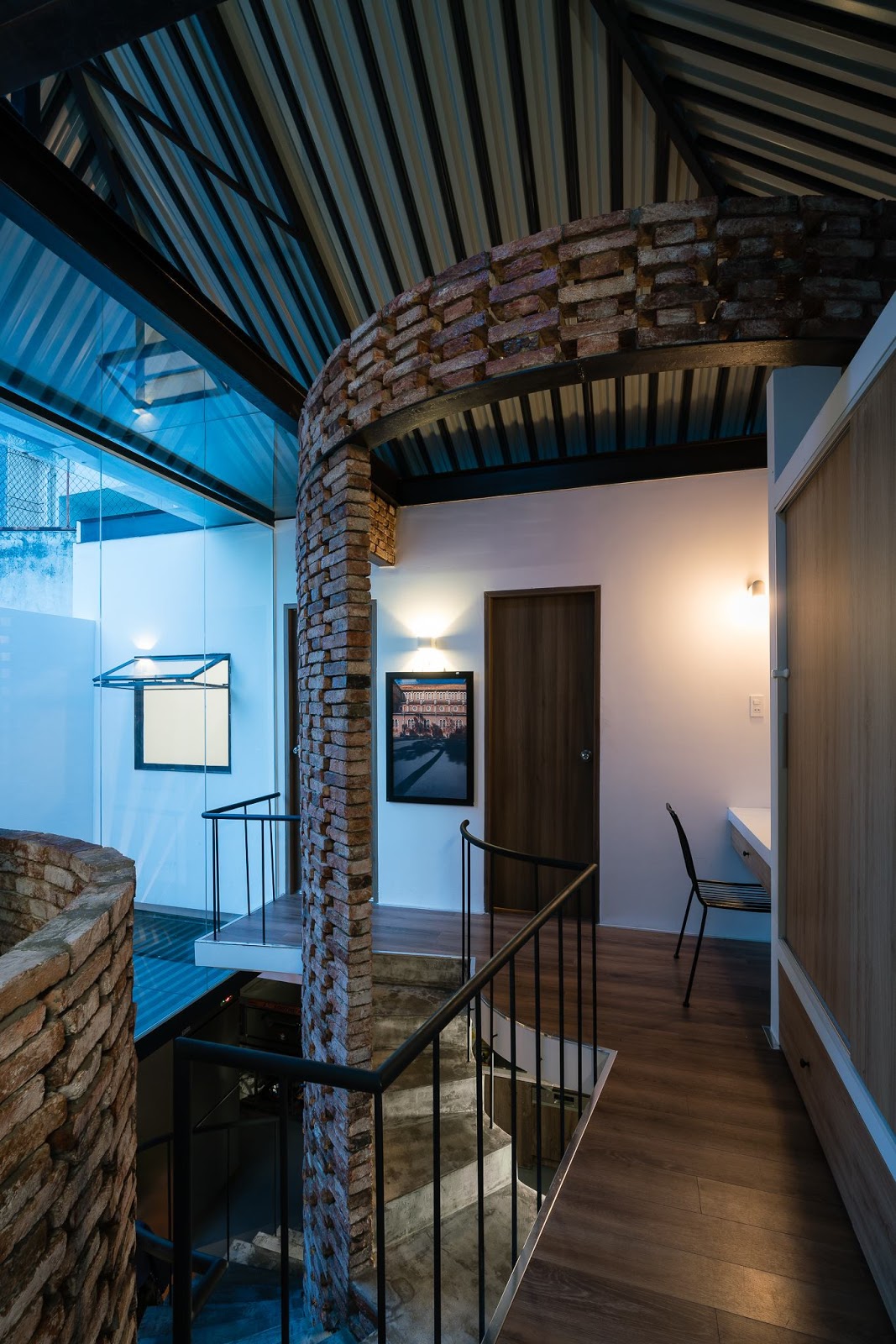 Được thiết kế cho một cặp vợ chồng trẻ có nhu cầu sinh hoạt đơn giản, khu đất bề ngang 6m là một lối thoát khỏi kích thước nhà phố điển hình Sài Gòn (4m), cho phép chia tách mặt bằng cả theo chiều dọc và chiều ngang, hình thành sự đa dạng của không gian. Tính riêng tư – yếu tố quan trọng của loại hình nhà ở – trước tiên được tổ chức theo chiều sâu và sau đó theo chiều cao của công trình. Sự tổng hợp này sẽ bố cục vị trí trước – sau – trên – dưới các thành phần chức năng. Giá trị công trình cũ được cất nhắc về tính tự thân, vậy nên nhóm kiến trúc sư đã giữ lại khung kết cấu hiện trạng, gia cố vào hệ khung mới đỡ sàn tầng lầu, nhằm tăng diện tích sử dụng.